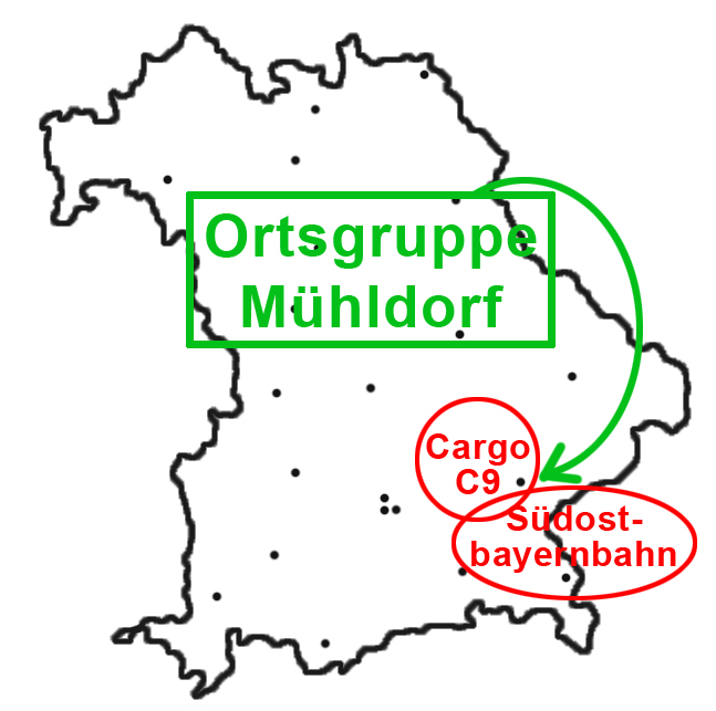 Wie die Karte schon erahnen lässt, arbeiten die meisten unserer Mitglieder bei der Südostbayernbahn oder bei DB Cargo C9 in Mühldorf.